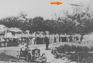 A rare photograph of entry number 5 in the Catalan Cup Race at a track in France. This picture also included a strange unidentified flying object seen over the tree tops beyond the line of spectators watching this race. There is no indication whether the photographer saw this object and intended to get it in the picture.