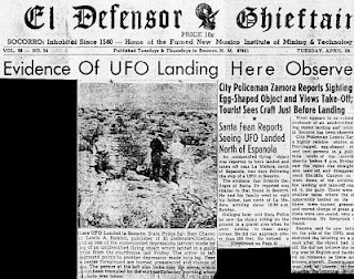 The Lonnie Zamora incident was an alleged UFO close encounter which occurred on Friday, April 24, 1964, at about 5:50 p.m., on the outskirts of Socorro, New Mexico. Several primary witnesses emerged to report their version of the event, which included the craft's approach, conspicuous flame, and alleged physical evidence left behind immediately afterward. Lonnie Zamora, a Socorro, New Mexico police officer who was on duty at the time, who claimed to have come closest to the object and provided the most prolonged and comprehensive account. Some physical trace evidence left behind—burned vegetation and soil, ground landing impressions, and metal scrapings on a broken rock in one of the impressions—was subsequently observed and analyzed by investigators for the military, law enforcement, and civilian UFO groups.